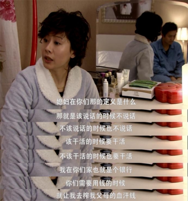 媳妇对于婆婆的做法,既无奈又愤怒,丈夫也拎不清,只会愚孝,一味让媳妇妥协,顺从老人,老人强势,媳妇忍让,男人心安理得享受亲妈给自己争取来的一家之主的地位和便利,这样的一种情况下,最委屈的是媳妇。